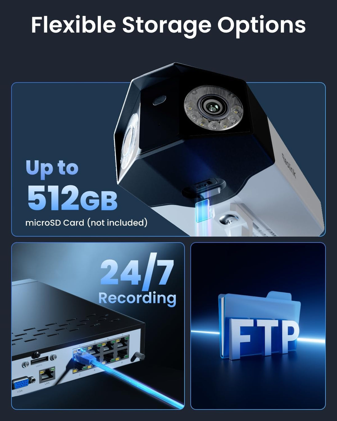 - Multiple Recording Options - Reolink Duo 3 PoE supports 24/7 continuous, motion-triggered, or scheduled recordings. All the videos can be saved to the micro SD card (up to 256GB, not included), Reolink NVR or FTP server. Choose a way you like and enjoy customized security.