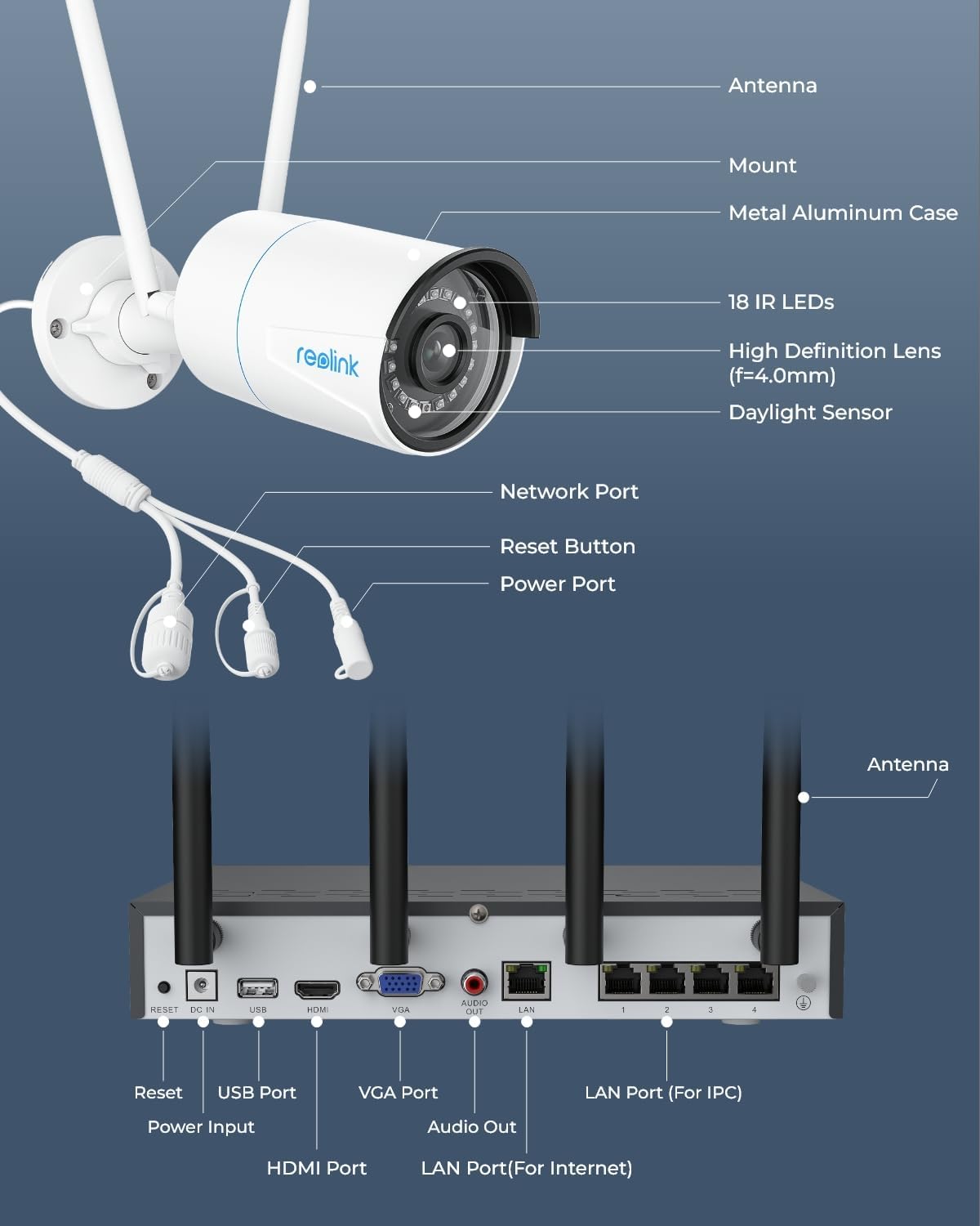 - Easy & Convenient Setup - Step 1: Start the NVR - First connect the NVR to the power supply, then to the monitor via an HDMI/VGA cable and to the router via a network cable. Step 2: Start Camera - Power on the camera and connect it to the NVR via a network cable, then initialize it on the monitor and synchronize the Wi-Fi. Step 3: Live View - Disconnect the network cable from the camera and mount it in the desired location, then view the live view on your monitor/Reolink App/Reolink Client.