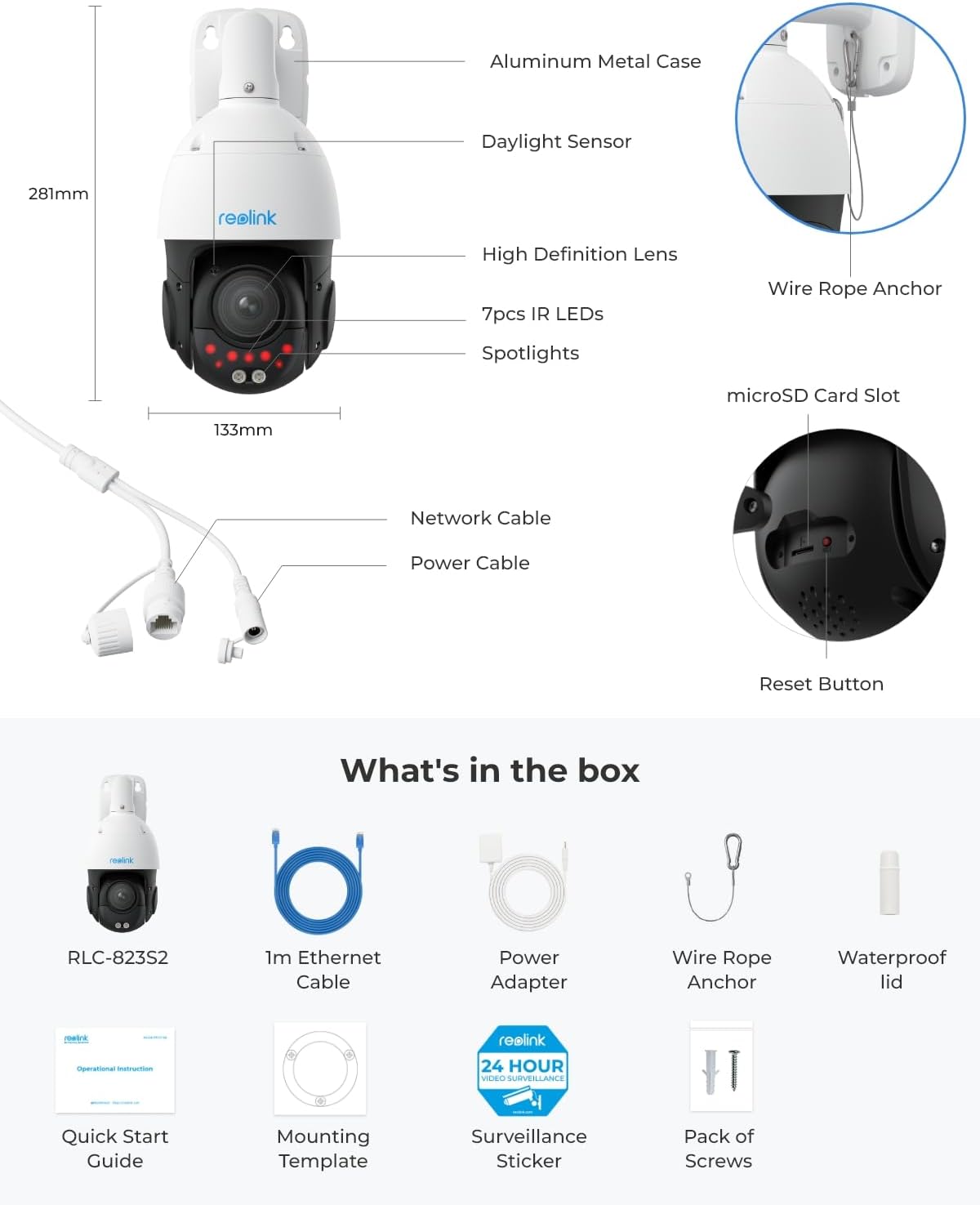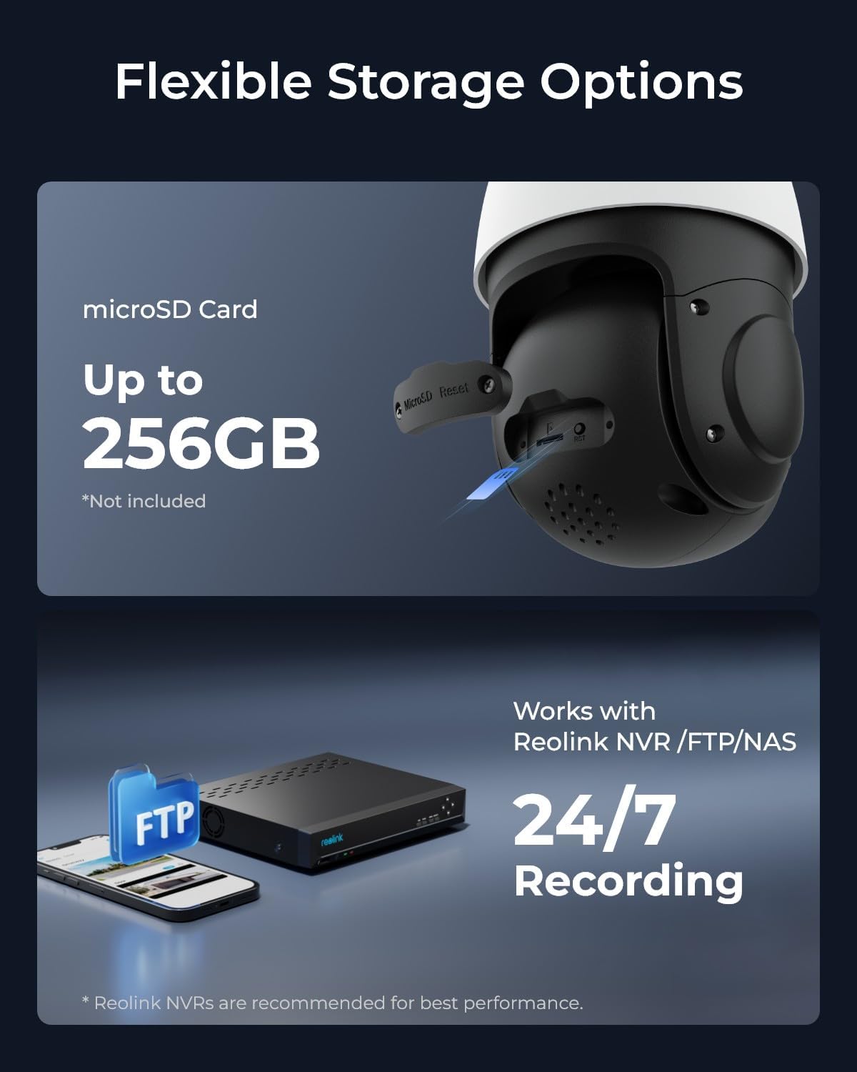 - Flexible Storage Options - Choose how you save your moments with the RLC-823S2. Store memories locally on a microSD card (up to 256GB) for standalone convenience. Opt for continuous 24/7 recording on a Reolink NVR, or securely archive your footage on an FTP server.