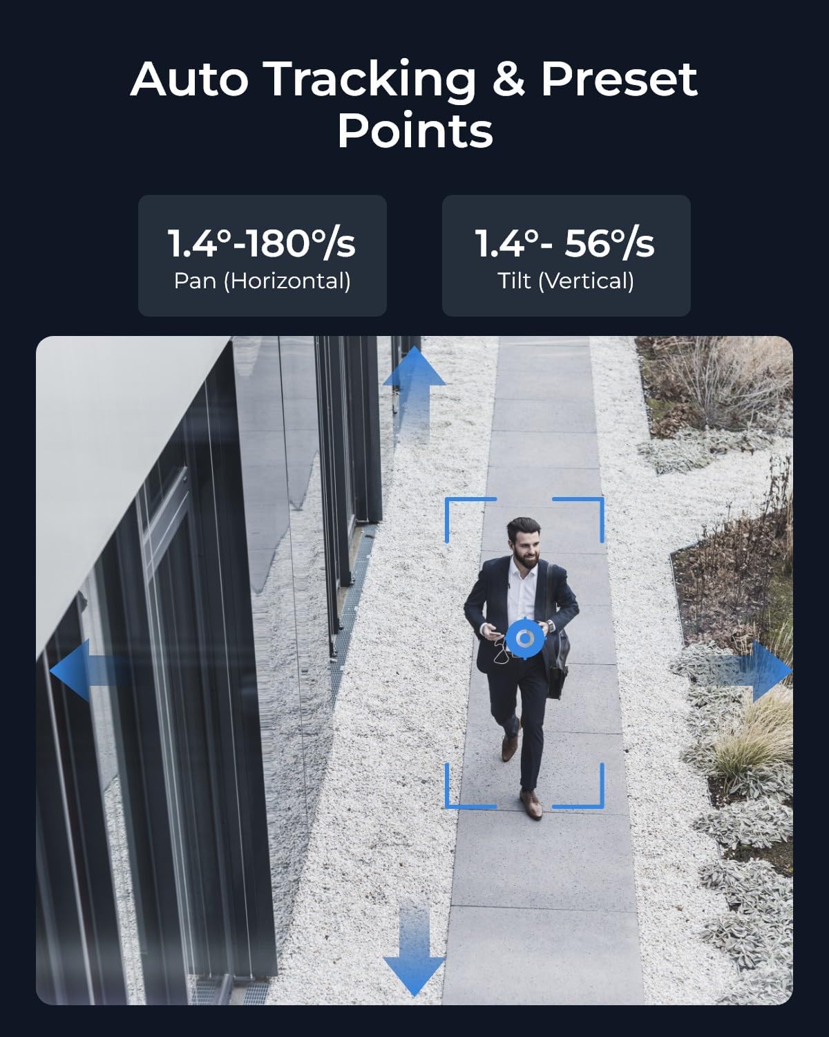 - Auto Tracking - Once a person/vehicle/animal is detected, the camera will follow and keep it in sight for however it remains within the area, so you won't miss anything important.