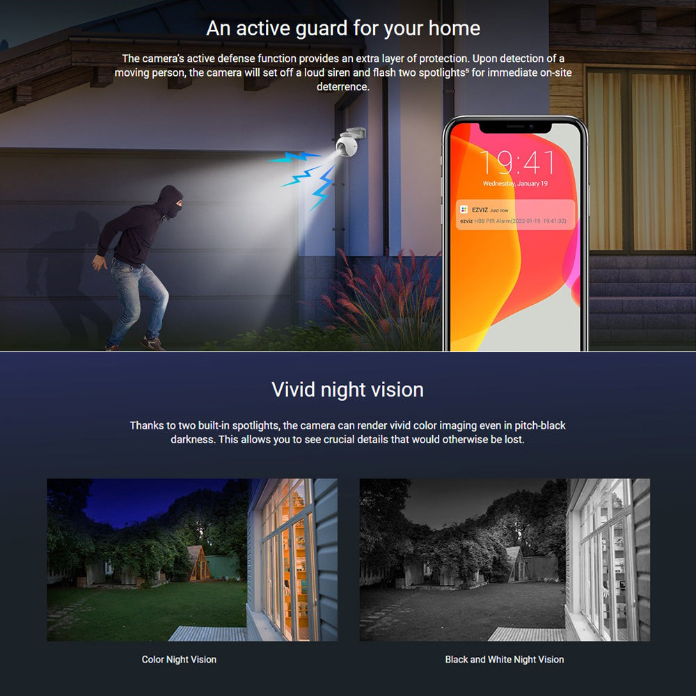 - Une protection active pour votre maison – La fonction de défense active de la caméra offre une couche de protection supplémentaire. Dès la détection d'une personne en mouvement, la caméra déclenchera une sirène puissante et fera clignoter deux projecteurs⁵ pour une dissuasion immédiate sur place.
